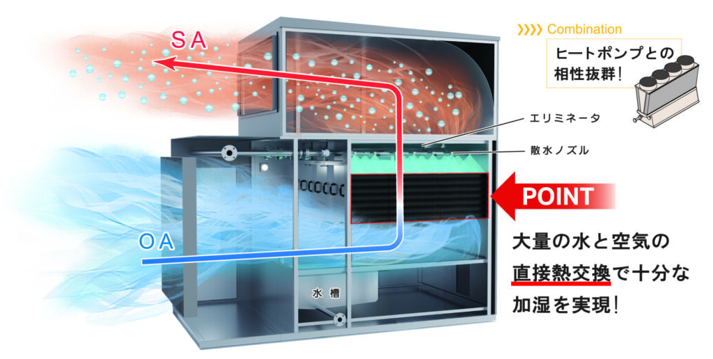 空調機に取り込まれた空気は、散水ノズルより噴霧された循環水と熱交換し冷却除湿、または加温加湿され、任意の温度の飽和空気(相対湿度100%)になる。その後、吹き出し設定温度まで昇温され室内に供給される。