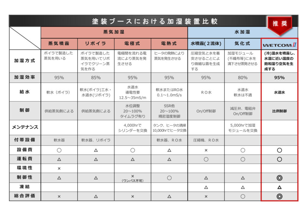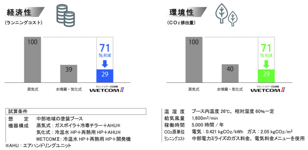 塗装ブースの空調は、温度調整の容易さや低イニシャルコスト、省スペースの点から蒸気式が主流だ。しかし、効率が悪くCO2の排出量が多いという課題を抱えている。一方、蒸気を使用しない気化式・水噴霧式は、ヒートポンプを熱源としているため、蒸気式よりエネルギー効率に優れている。しかし、冬場の低温低湿な空気への加湿性能が劣り、制御も安定しない課題があった。