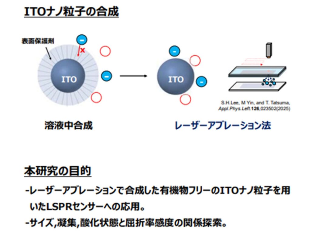 ▽発表内容=レーザーアブレーションで作製したITO(アイ・ティ・オー)ナノ粒子集合体を用いた、プラズモニック屈折率センサー