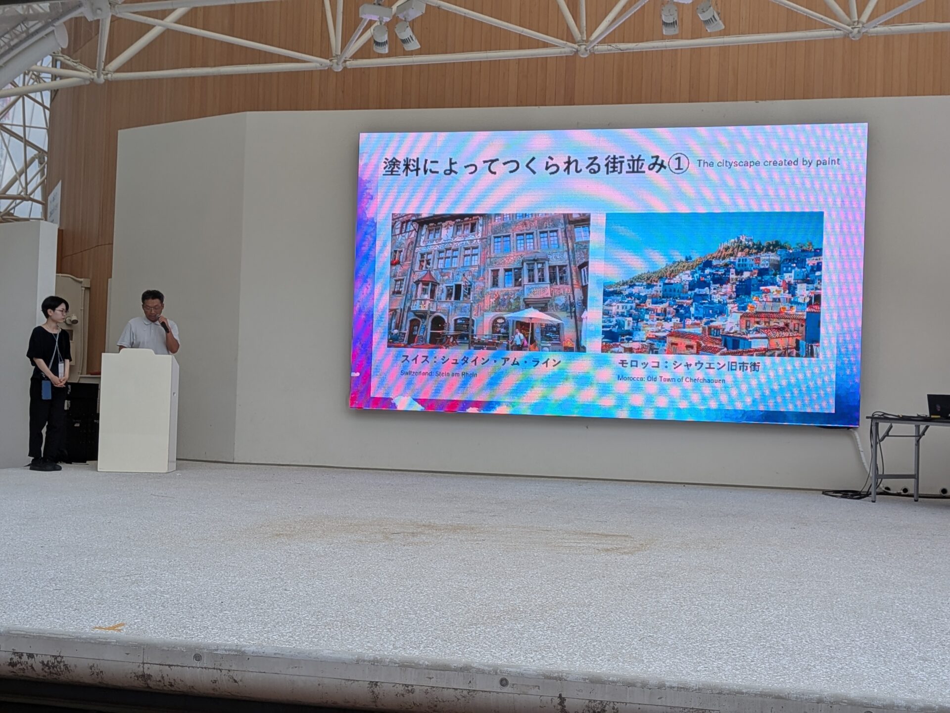 彩りに関する事例紹介では、スイスの壁画で彩られた街や、青と白で統一されたモロッコの街並みが挙げられた。大阪でも都市開発で姿を消したが、梅田の梅北地下通路にはかつてプロが描いた壁画があり、暗い空間を明るく変えたと紹介。塗料は空間の印象や人々の気分を変える力を持つと強調した。