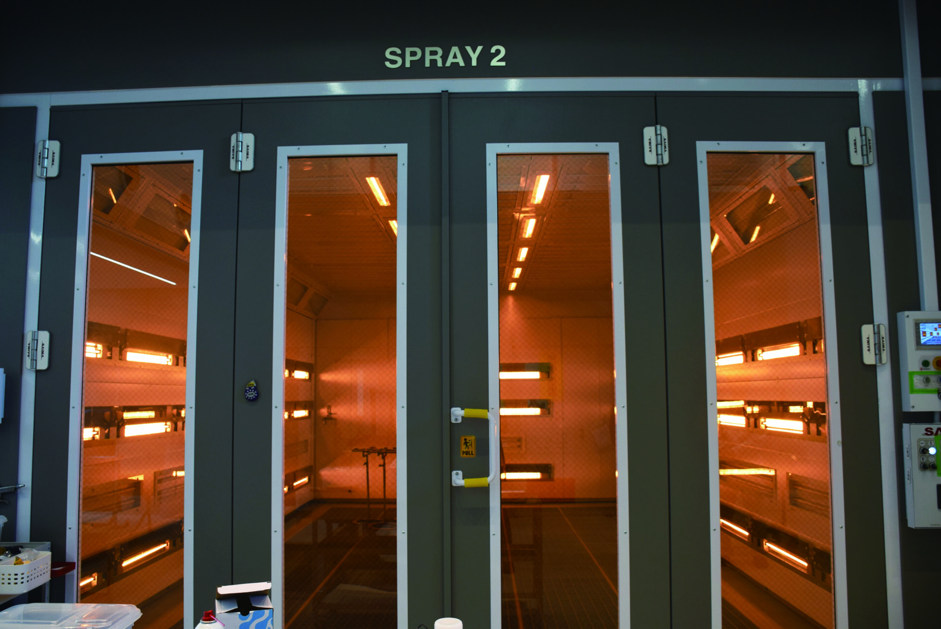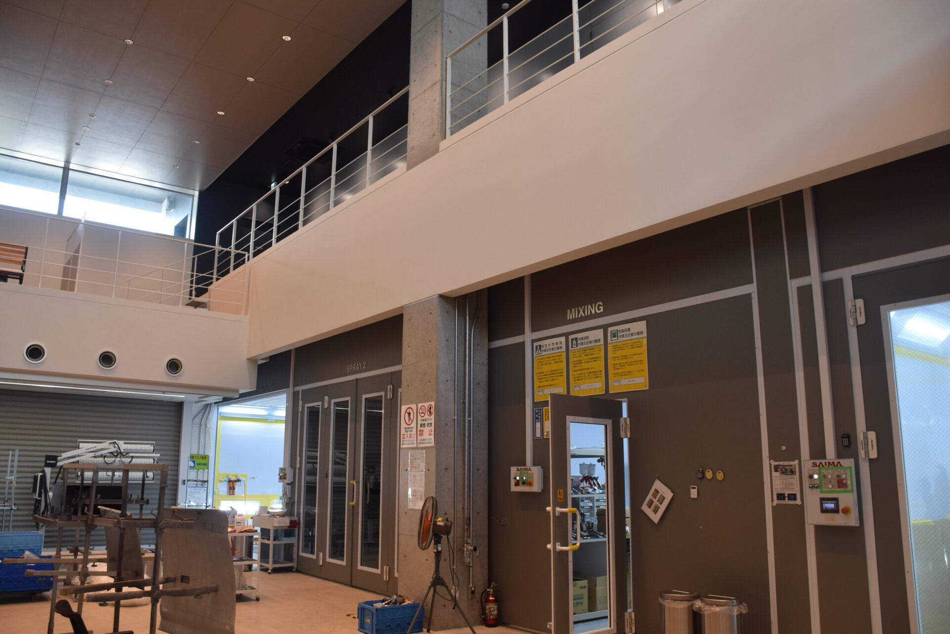 建物の内観、1階は塗装ブース2基、調色室、プレパレーションルームで構成