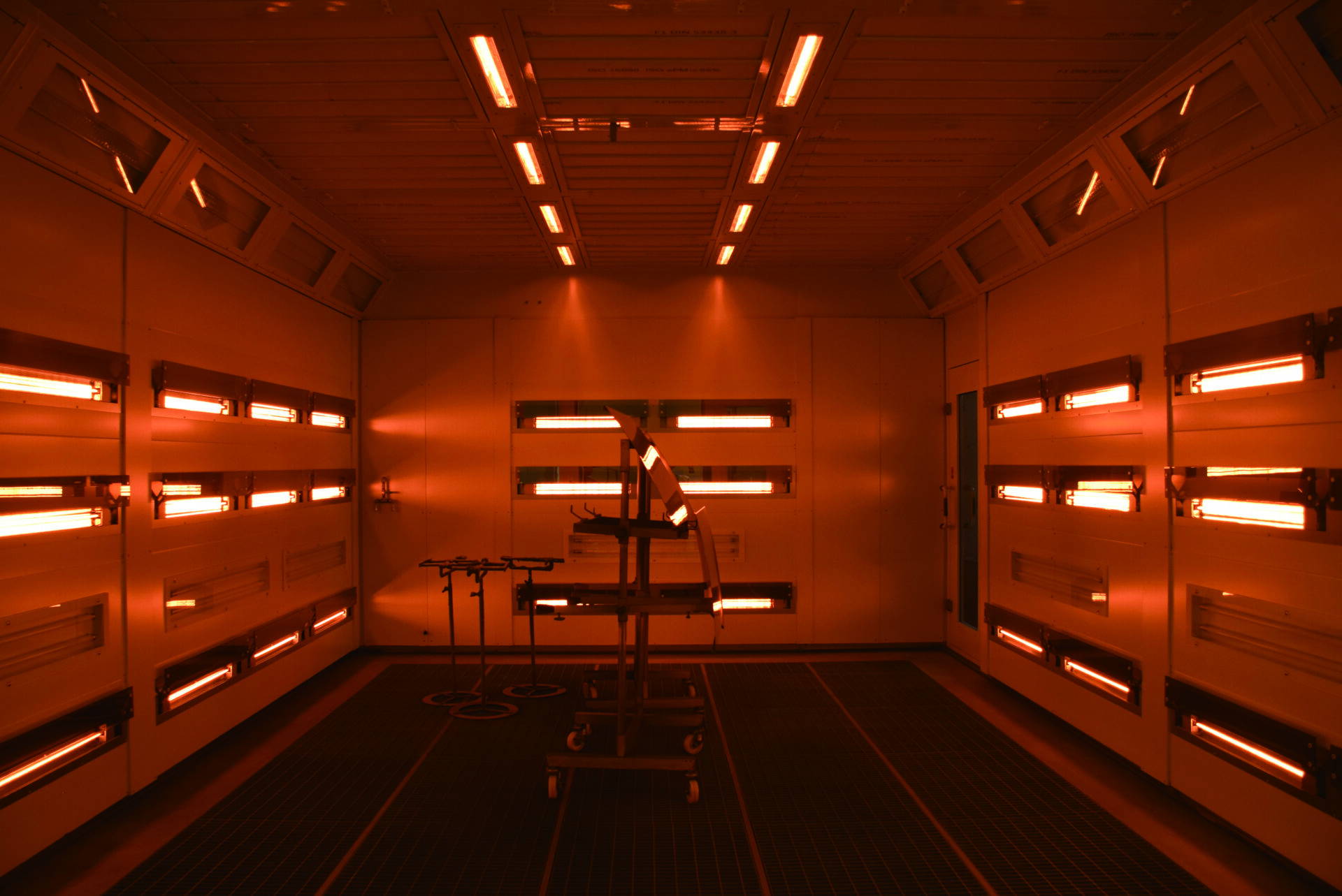 特筆すべきは、ガス式乾燥と赤外線(IR)式乾燥を1台で対応可能なハイブリッドブースを採用した点である。このブースでは、顧客の乾燥設備を再現しつつ、両方式の違いも体感できる設計となっている。近年、ユーザー側でも生産性向上を図るため、乾燥ブース等の設備更新が進む。
