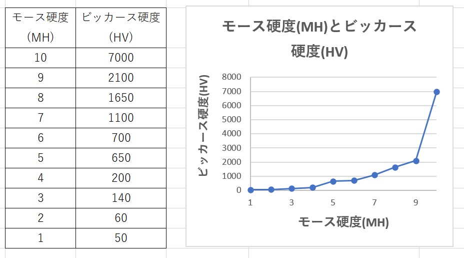 図2は、モースの硬度をビッカース硬度で表現しなおしたグラフである。見てわかるように、モース硬度の間隔はきずつき硬さ的には等間隔ではなく、特にMH9(ガーメット)とMH10(ダイヤモンド)ではその引っかき硬さにおおきな隔たりがあることがわかる。その隔たりを埋め、15段階の数値で表した尺度が「修正モース硬度」(新モース硬度)である。