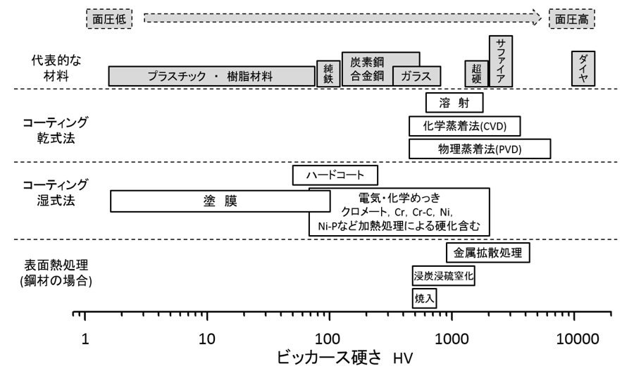 図3は現在、工業的に使用されているいろいろな材料の表面硬さをビッカース硬度で換算し、1元化したものである2)。図中の「塗膜」、「ハードコート」は筆者が超微小硬度計で測定した各種塗膜(溶剤型1液、2液、無溶剤2液、3液系、水性1液、2液系材料)、ハイブリッド系機能性ハードコートのマルテンス硬度値をビッカース硬度に換算したものを載せた。ガラスには届かないものの、ハードコートの材料的存在位置を示している。