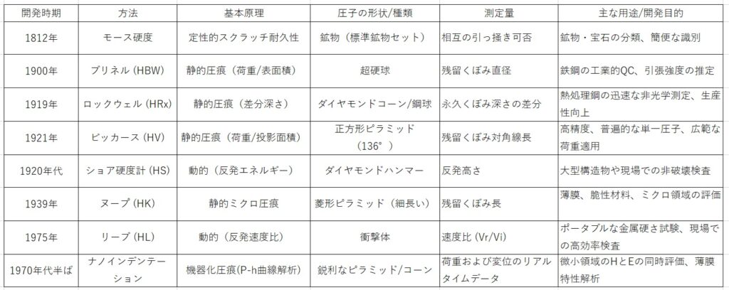 表2は人類が開発してきた硬さの測定技術の主要な進展を、原理、測定方法、開発目的に応じて時系列にまとめたものである。