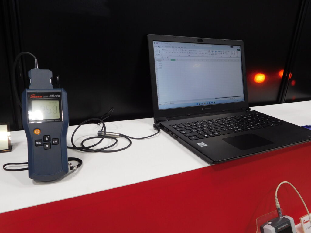 同社ブースに立ち寄った来場者は、「塗装品の下地処理である程度素地が粗いため、粗い面上でも測定できる製品を探していた」と、コートマスターフレックスに興味を持っていた。