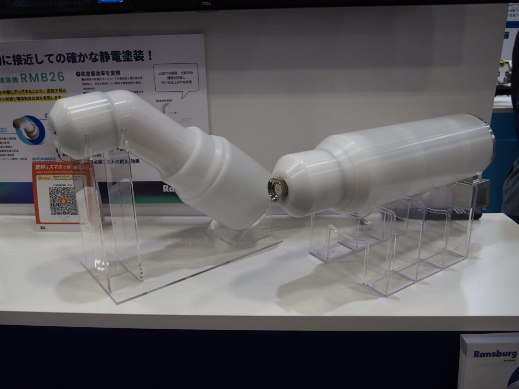 加えて「RMB26」での塗装は、複雑なティーチングの必要がなく、凹凸箇所でも容易に塗装可能で、人手不足の課題にも貢献できるとした。他にも、電源不要のエア駆動式高性能静電ハンドガン「RansFlex RX」やハンドスプレーガン各種、オートスプレーガン各種等、カラフルな製品がブース内を彩っていた。