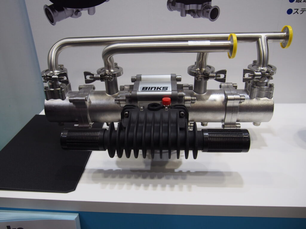 ポンプでは、精密塗料供給装置「デュアルシリンジポンプは2液塗料の硬化剤、UV塗料の搬送に最適。電動スマートシリーズは標準的な耐圧防爆電動モータ使用でフルイドセクション部を動かし、塗料、溶剤等の液体を供給する。メイプルポンプは溶剤/水性塗料、溶剤その他の材料を供給するベローズ型ポンプ。同社ブースを訪れた多くの来場者は、実演に目を向け、その安全性を確認。また、展示された製品詳細について担当者から説明を受けていた。