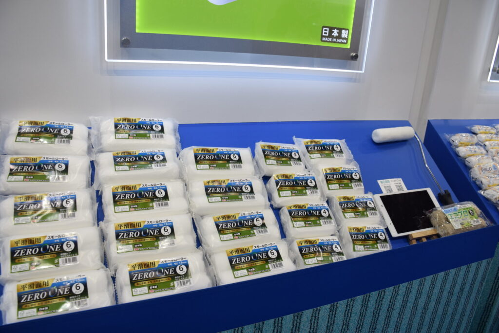 ホームセンターでローラーを購入する客層は二極化しており、DIY向けの個人と、最近増加しているプロ層の職人に分かれる。ピーアイエーのブースでプロ向けとしてDIYショーで大きくPRしたのが、片べりが少なく耐久性に優れた「ZERO ONE」。このローラーも環境配慮型製品として、再生繊維を使用し製造時のCO2排出量を従来製品より16%削減している。こちらは、環境配慮を第一の目的とするというよりも、「キメの細かい美しい仕上がり」を求めるプロ向け製品に、環境配慮型という付加価値が両立した一品と言える。