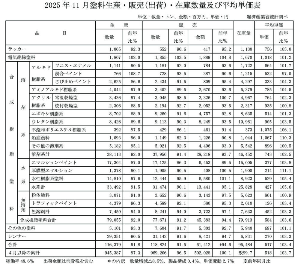 日本塗料工業会(毛利訓士会長)は2025年11月の塗料実績(経済産業省統計調べ)を発表した。生産数量・販売数量とも前年同月比で減少が続き、販売金額も減少に転じた。生産数量は11万6379tで前年同月比8・2%減。販売は数量が11万8824tで同8・5%減、金額は614億1200万円で同5・4%減となった。在庫量は9万5484t、平均単価は517円で同3・4%増、稼働率は48・6%であった。